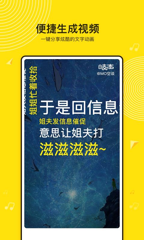 吱声app是一款语音社交应用,用户在此可以通过60秒的语音分享你的心事、你的语音作品以及你的情感故事,只要你发布了语音动态就会收到来自全国各地好友的评价或是聊天,即使你有什么难题也可以在此发布语音动态向别人求助,大家集思广益,总比一个人办法强得多。而且,无聊的时候还能听一听这里的语音搞笑段子发送心情,自己有什么好笑的事情、经历也能发布出来娱乐娱乐。重要的是,这里有着便捷的视频制作功能,能够为你的音频作品配上视频、文字、音乐等内容,用户可以凭借自己的音频或是视频作品收获一批粉丝,说不定可以成为网络红人,还在等什么,这么有趣的应用马上下载吧。