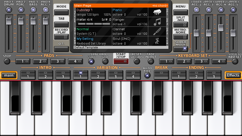 模拟KORG键盘:Fade,Synchro,键盘设置,速度,移调,八度,平衡,调谐,分割,和弦记忆,分接速度/重置等。