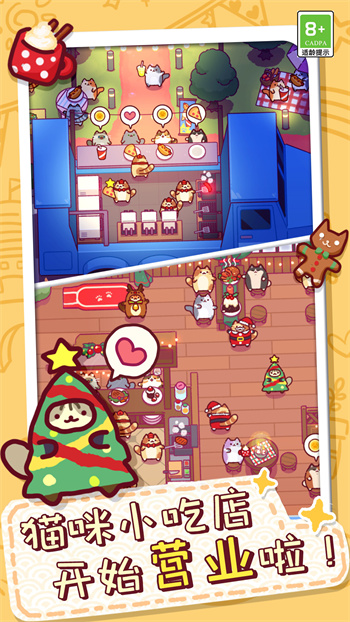 拥有十分经典的游戏玩法的,其中的流程在猫进店之后,是为用户提供多种职业以及多种食物随意选择。