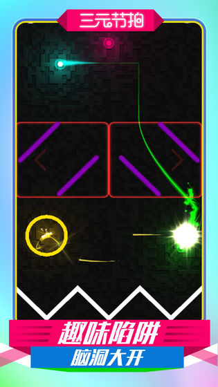 三元节拍是一款需要非常良好节奏感的小游戏,这款游戏之中玩家需要通过其中播放的音乐来进行着小球的跳动,每当歌曲的旋律发生改变的时候小球都会改变自己的颜色,这样就能让玩家清楚的了解到该旋律应该采用什么样的节奏来进行游戏,让玩家能有着一种良好的游戏体验。