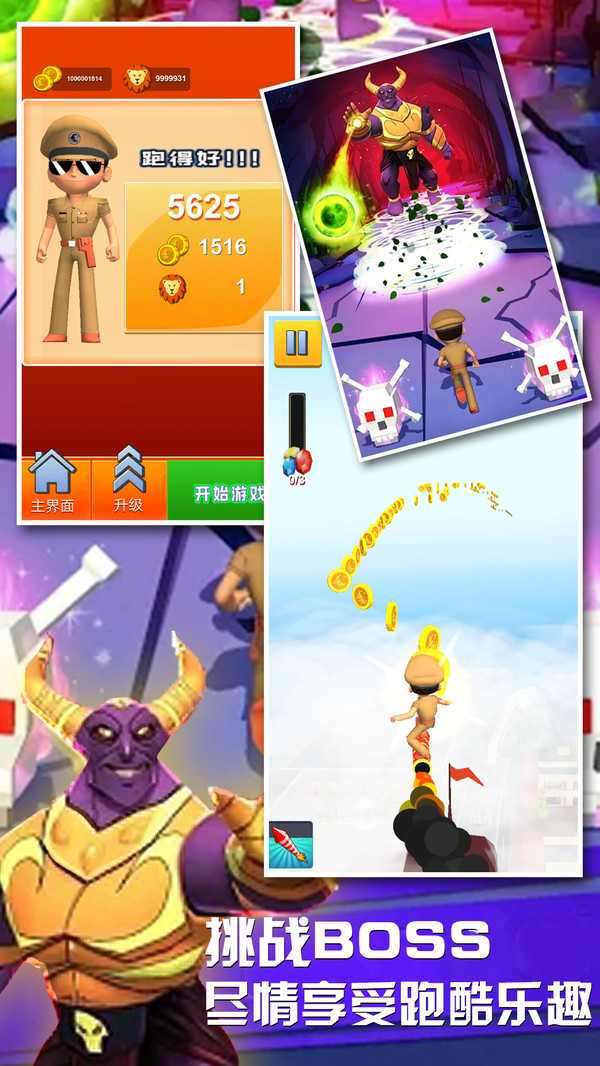 可以在路上收集金币来购买道具和武器帮助你,后面的坏蛋越来越坏,你要面对更难的挑战。