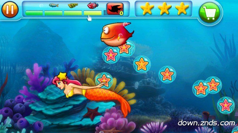 随着不断的吃小鱼,界面上方靠左的绿色成长条会慢慢增长,被大鱼攻击到就会使其下降。右边的3颗星星为过关评价,被攻击后会使星星破碎从而降低评价。
