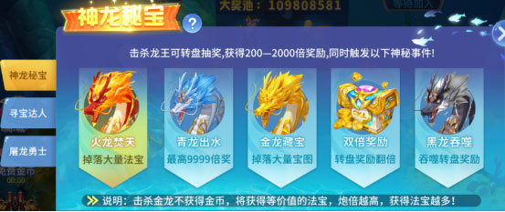 神龙秘宝 击杀神龙拿宝藏,传说在《捕鱼大决战》的某处神秘海底,存在着拥有大量宝藏的神龙一族,而如今宝藏所在地已被找到,击杀神龙及其手下的龙族勇士,可获得海量奖励。所以在神龙秘宝的场景中,大家最期待的就是与神龙BOSS来一场不期而遇的遭遇战了,因为击杀BOSS可获得最高9999倍大奖,更有法宝、藏宝图等您来拿,秒变高富帅。