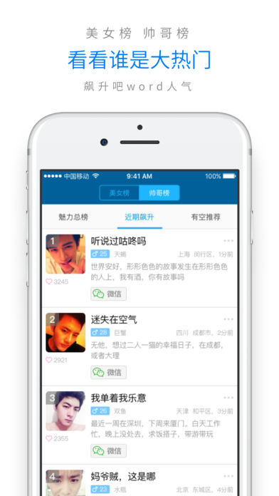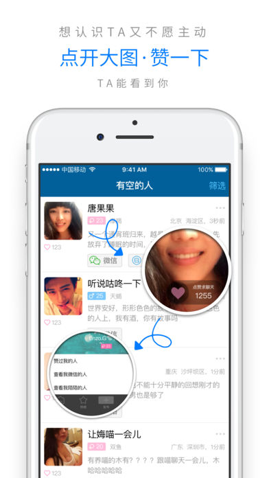 在这个交换微信号陌陌号的加好友软件,都可以在这里实现,制定把妹计划,开始你的邂逅缘生活。