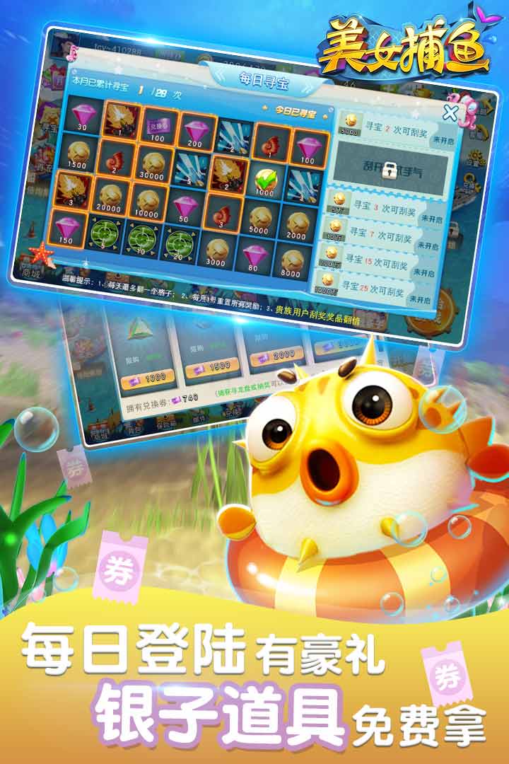 捕鱼游戏拼刺激,精彩活动享不停。全新兑换系统,换道具换钻石更能赢话费。捕鱼赢话费嗨全场,并推出月卡功能,超值返利与优惠。
