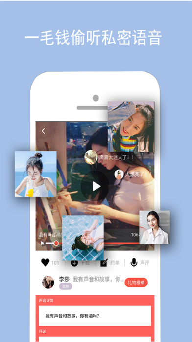 总有一个女神的声音是你喜欢的。私人订制·让想像发声--无论你脑洞有多大,只要你有想要得到的声音,在这里无论是性感还是妖娆,成熟还是妩媚各路女神的嘤嘤之声为你坐镇只有你想不到,没有她们做不到,每一期不一样的独有‘新鲜’主题声音征集,各路女神妹纸如洪水般前来为你发声。偷偷摸摸的来听你--暗恋的感觉形容成四个字就叫偷偷摸摸,总是胆怯又不敢迈出一步,看起来特别怂,有木有?偷听始终技术活儿,对自己心仪的妹纸得不到人也要得到她的声,也许一个不小心你的耳朵就会被撩拨到从此不能忘记。礼物互送玩法--互送礼物可以使你心仪的女神马上注意到你的同时提供更自然的搭讪氛围喔。