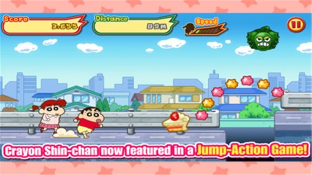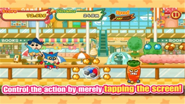由于蜡笔小新大力飞奔向前,躲避障碍,通过点击屏幕收集糖果