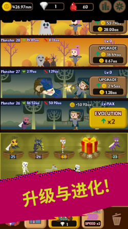 每一场战斗你都可以自由搭配怪物的组合,以它们独特的技能和属性去战胜僵尸BOSS,玩法相对来说还是很轻松的,配备好阵容之后直接挂机让系统AI自动为你战斗,合并自己的怪物可以生成新的强力怪兽,拥有更强大的属性和技能,战力爆表。