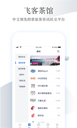 来自多个国家多个城市的用户汇聚在这里,共同讨论酒店、航空、信用卡的各个方面:会员快速升级、里程兑换机票、信用卡优惠打折……起飞降落城市转折,无论你在世界的哪一个角落,无论你将去向何方,都能在飞客茶馆找到和你志同道合的朋友,聊酒店、聊积分、聊人生等话题,开启你的常旅客之旅。