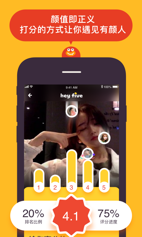 都说交友始于三观,毁于颜值。如果从一开始就是真实颜值,你会不会找到喜欢的人?heyfiveapp就是一款与众不同的交友软件,这是一款给颜值打分的app,每一个新用户都要提交真实照片,只有经过管理员和用户打分才能进入社区。确保了每一个用户的资料是真实可靠杜绝虚假。相同审美的人会遇到志同道合的朋友,开展有趣的聊天。感兴趣的小伙伴们快去下载体验吧!
