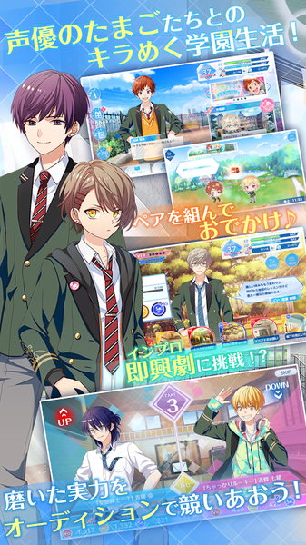 游戏以女性向恋爱养成为题材,你将引导30位梦想成为声优的男孩子,成为顶级声优;培育自己队内的声优们,和大家一起参加全国选拔赛,可以选择学生们配音的场景,提升声优等级邂逅甜蜜爱情。