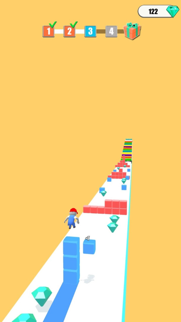 玩家将在游戏中控制自己的小人踩在不同外观的方块来进行冒险。你可以通过收集赛道中的方块来增加你的高度,而当你遇到拦路的障碍物时就会失去相应的方块。有的时候并不是越高越好哦,因为有的障碍物也会非常的高,你需要从两个之间穿过去,这就需要你好好地控制高度了。