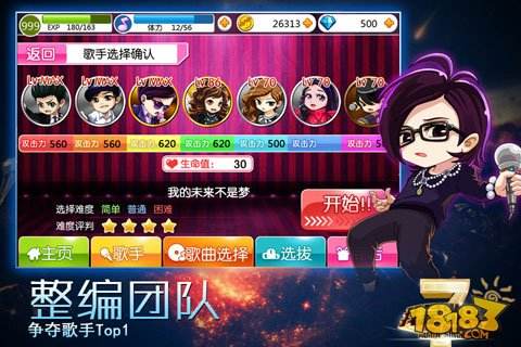 游戏模式:编成自己的歌手队伍,每个歌手都有不同的生命值和攻击力,歌手们的潜力,由你挖掘。你可以通过“升级”和“突破”来栽培歌手,下一个superstar或许就是你的杰作!