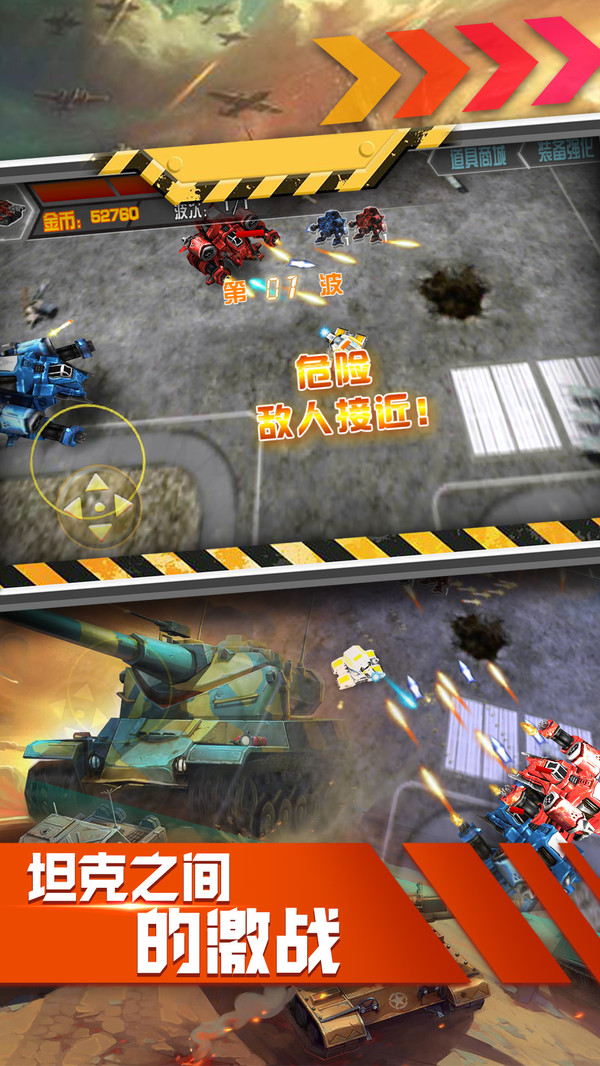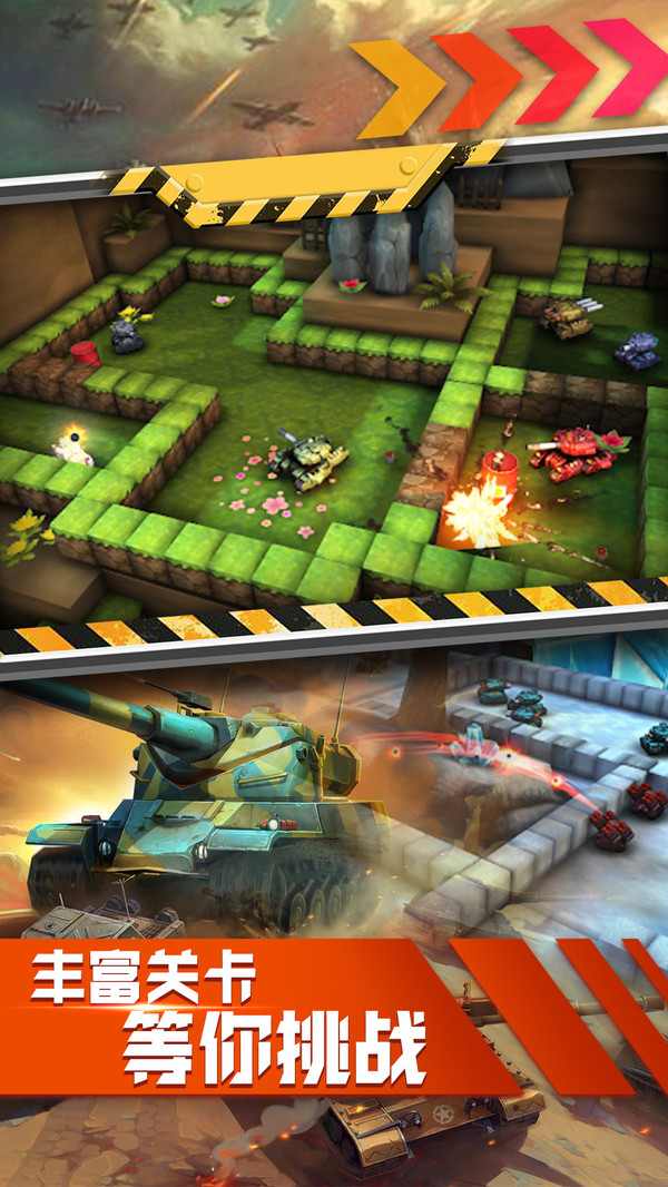 不同的超强坦克作战武器自由使用,打败各种敌人BOSS,突破关卡;