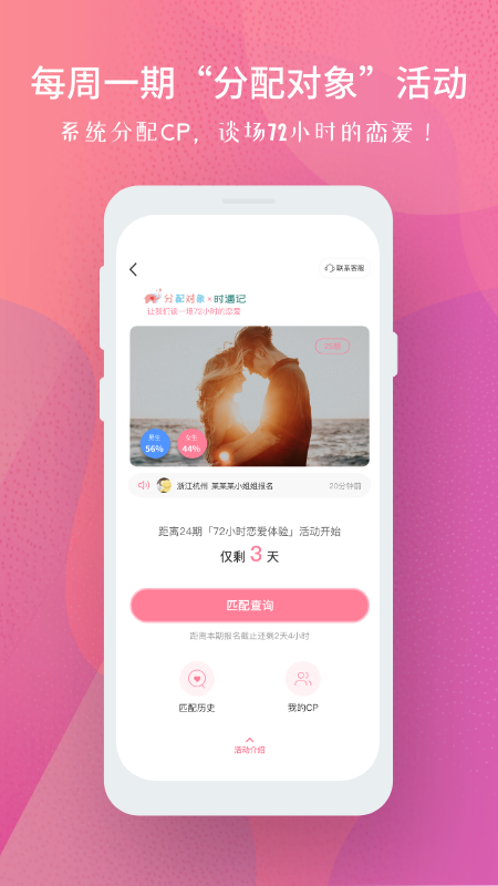分配对象app是一款专为95后打造的手机恋爱社交软件,在该软件中需要用户通过手机号码注册登录,同时需要进行身份认证或是视频认证,以更好的确保每个用户信息的准确性和真实性,然后用户在这里就可以开始系统好友匹配,并进行72小时的CP恋爱体验,这样能让两个人快速的了解彼此,轻松带给你全新的恋爱体验。而且当用户遇到心动的,喜欢的就可以直接进行关注对方或是互换微信、QQ、手机号等联系方式,快速摆脱单身行列。