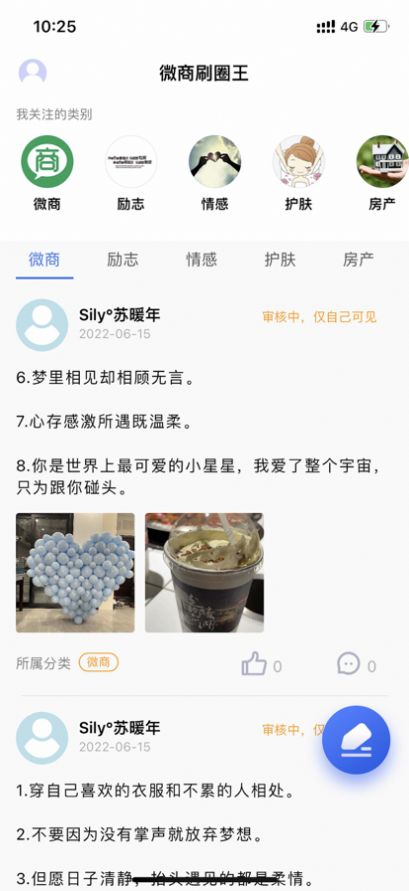 微商刷圈王app是一款专为分享朋友圈而打造的文案内容参考软件,各种类型的文案信息都有,可以参考,也可以直接借鉴使用,让你的朋友圈文案能更吸引别人的注意,喜欢的文案内容你可以收藏起来,在任何的时候,都可以轻便的使用,非常值得大家信赖哦。
