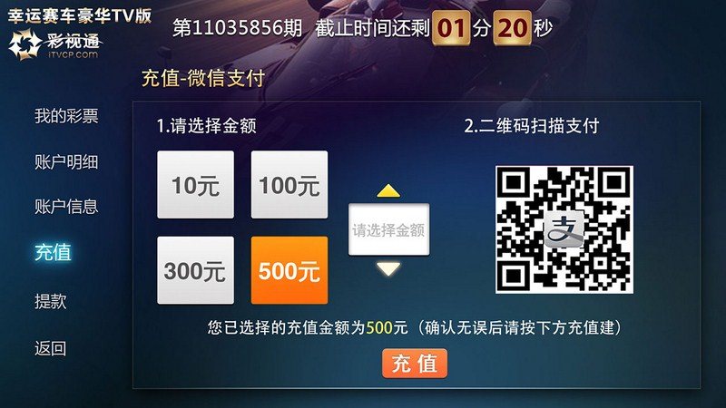 幸运赛车TV豪华版,是一款模拟F1赛车竞速的彩票游戏,与香港赛马有异曲同工之妙。不仅观赏性强,还可以自主竞猜、采用多种方法投注,更将彩票游戏与电视宽屏结合起来,集娱乐性、趣味性、即时性、运动性、直观性及刺激性于一体,玩法简单,电视大屏展示的开奖过程逼真刺激,扣人心弦。该游戏设置12辆虚拟赛车竞速,竞猜冠军,投注更有赛车美女幸运相助中奖。猜中即可中奖,返奖率高达59%,10分钟开奖一次,每天有多达84次的中奖机会。
