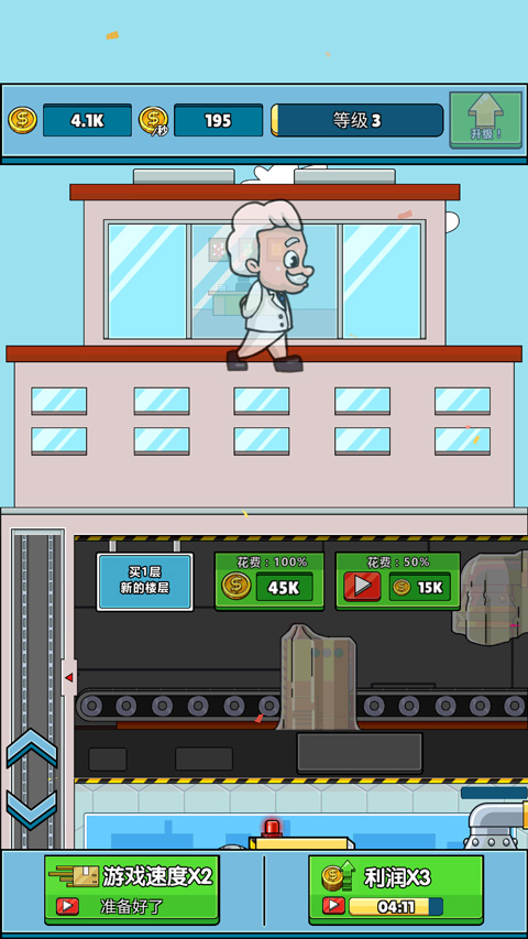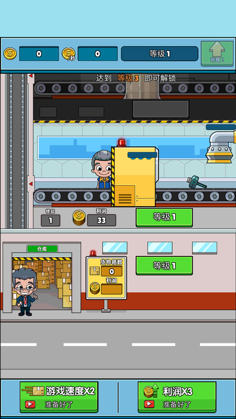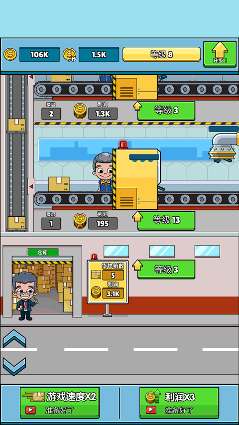 在初次规模的形成后,玩家便可着手该游戏的运营了,在运营过程中,所有产品制作完成后,便可前往运输出售,这区别所有的生产及游戏进度都是自动运行的,而你只需在金钱满足一定量级的基础之下,对楼层及工人们的生产速度进行升级便可。