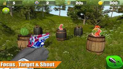 第一人称的视角展开挑战,瞄准传送带上的水果并用子弹把水果串碎即可获得更高的游戏分数。