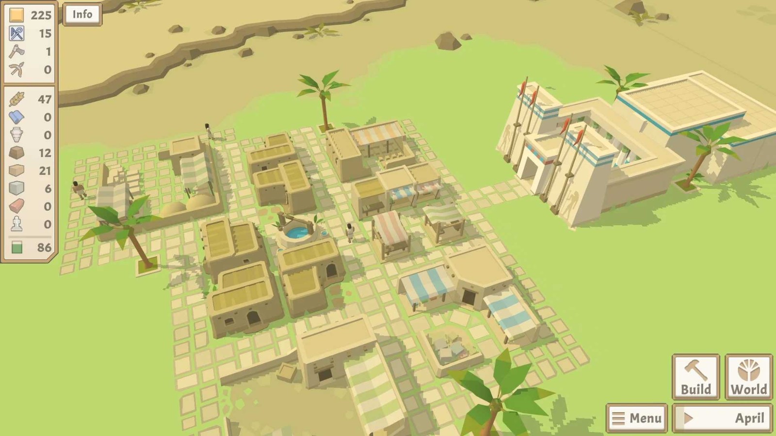 古埃及建设者是一款上帝视角为主的模拟建造游戏,玩家们将要去建造属于自己的古埃及帝国,拓展城市的规模,增加建筑物,打造各种娱乐场所等等都能增加城市的人数以此来提高我们的收入。它的画风非常清新,简单的放置类玩法也能让每个玩家都快速上手,很适合用来休闲娱乐。