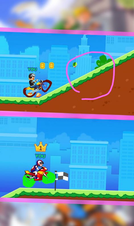 玩家可以根据不同的赛道地形,绘制合适的摩托轮胎,帮助角色快速行驶前进。