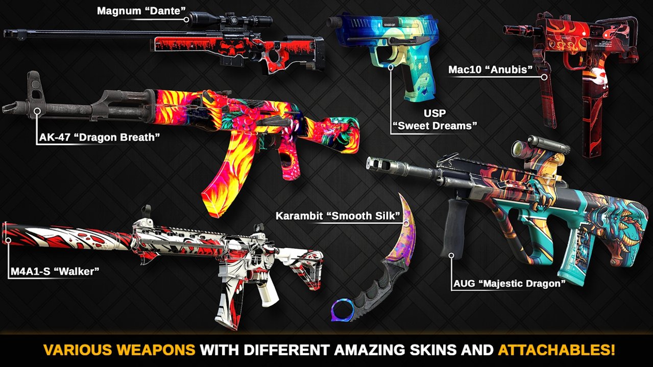 在各种游戏模式中消灭敌人取得游戏的胜利,然后获取相应的奖励。用金币购买自己喜欢的武器使用,还能购买防弹衣烟雾头盔这些游戏道具,帮助玩家更好的玩好这款游戏。多种竞技模式玩家可以选择。