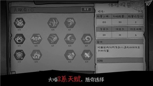 游戏玩法,每次退出游戏都要重新输入账号密码。建筑有科技树的在右下角有显示,点一下,等1秒。科技点打副本给。游戏最重要的3个建筑:大喵(天赋,长按显示内容。技能,点出新技能后会在右下显示,需要点击图标才能装备,最多2个。新伙伴),训练场(属性),个性改造间(伙伴技能,幸运提高成功率)。耐力在房间对应疲劳度,在副本对应血量,但疲劳度不会影响伙伴在副本的血量。冰箱找食物可降低疲劳度。探索可获得各种资源。