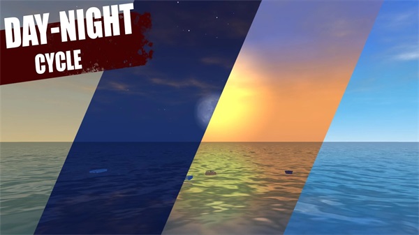 天气景色变化,有昼夜循环和不同的天气变化,可以感受到不同时间段的气候和景色的变化。这种真实的时间变化会对策略产生影响。以其栩栩如生的海上生存场景而闻名,海洋环境非常逼真,可以感受到海风、波浪、天气变化等真实的海洋元素。