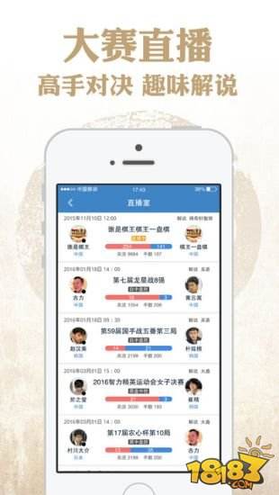 关注世界比赛:围观大赛直播、与职业解说互动,获取时时的比赛新闻和棋手资讯。