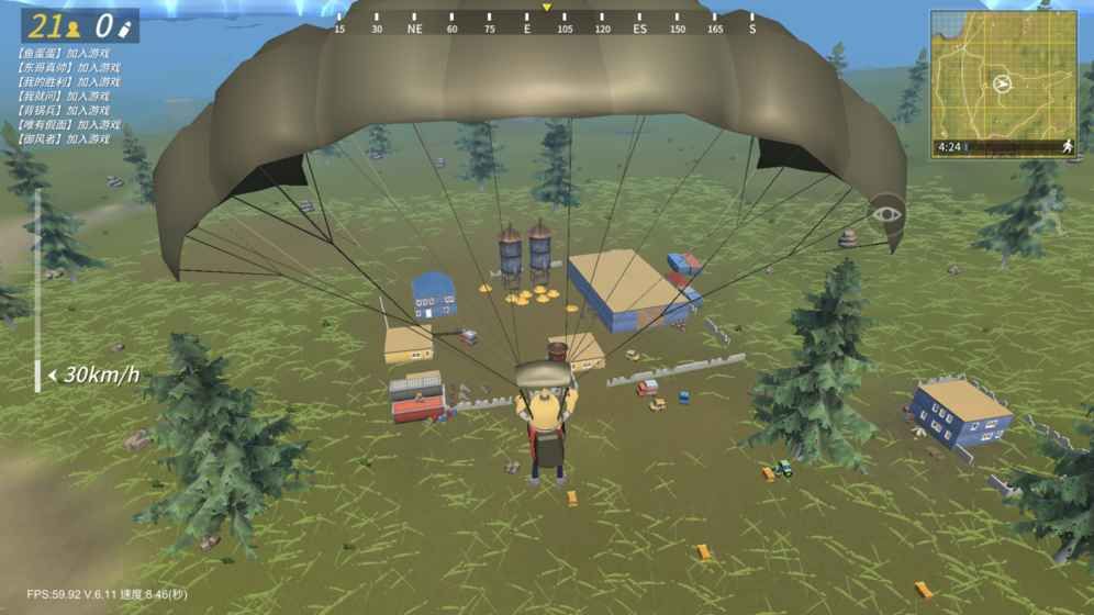 64km的大地图,有城镇,有野点,有树丛,有草丛,每局支持100名玩家对战。