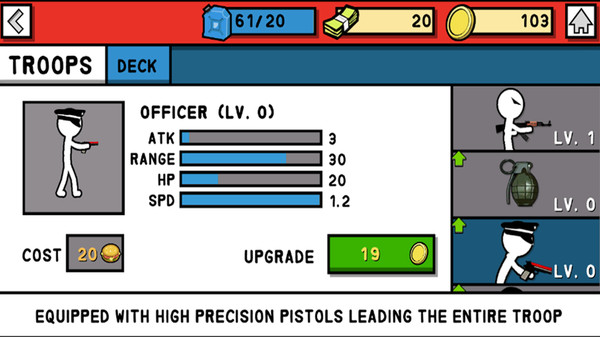每次击败敌人时,都会产生一些金币,可以招募更多火柴人来帮助你战斗。
