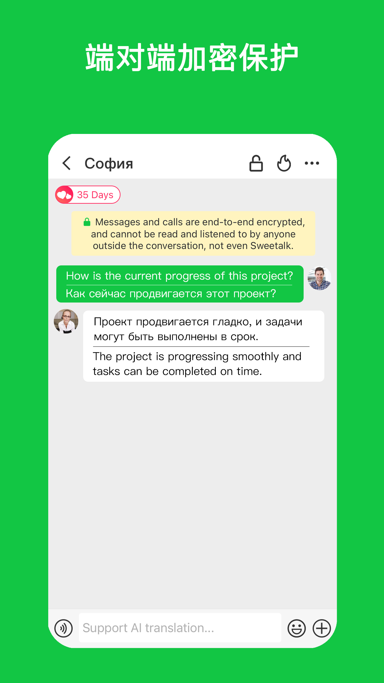 Sweetalk这样就可以选择将语音同声翻译成外文发送给对方,也可以使用Sweetalk软件,对以后或许会有意想不到的帮助,能够用户与世界各地的商业伙伴和朋友保持联系,你不仅可以聊天交朋友,比微信功能丰富且安全,通过其中的社交互动方式轻松找到你们的共同话题,快来免费下载吧
