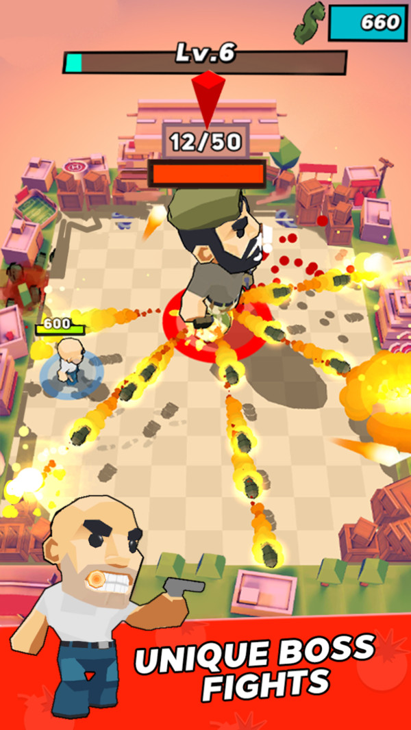 帮助游戏中的光头大佬赢得战斗的胜利来获取更多的射击武器。