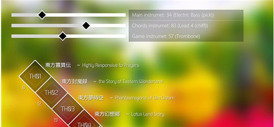 东方Project混音游戏游戏界面最上面的三条还可以调整按键与背景混响的乐器种类。