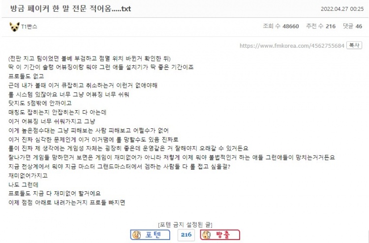韩网粉丝在fmkorea上整理了Faker在直播中谈及的韩服生态,“因为演员问题,英雄联盟真的有可能完蛋。”