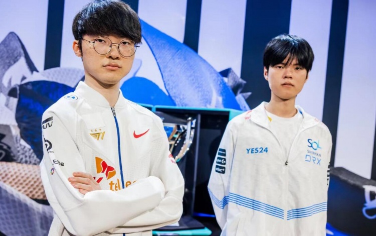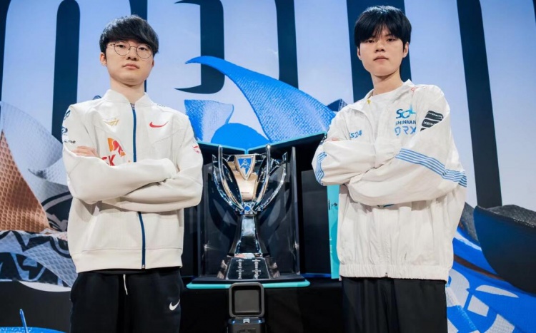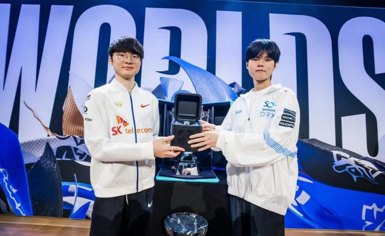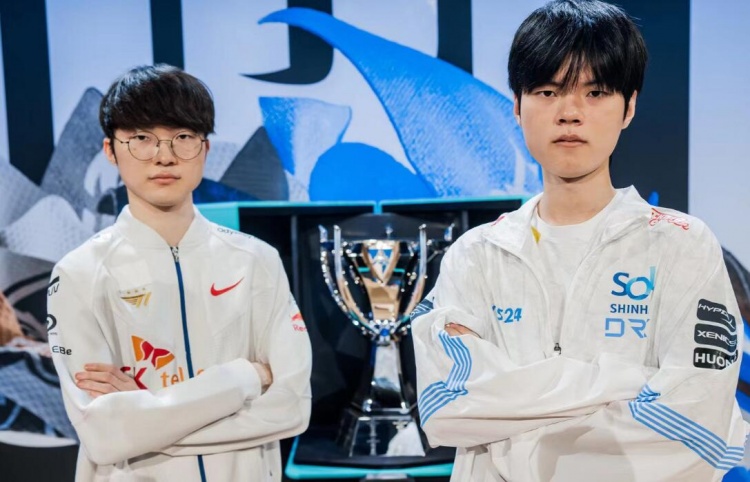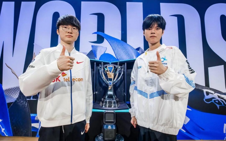 2022英雄联盟全球总决赛T1 vs DRX的冠军战将于6日开启,以下为媒体发布会上Faker和Deft选手的合影返图。
