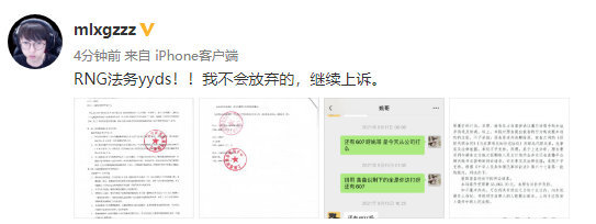 今日前RNG打野选手MLXG在其个人微博上发博晒出自己控告RNG拖欠自己1300万薪酬被驳回的文件并配文:RNG法务yyds!!我不会放弃的,继续上诉。