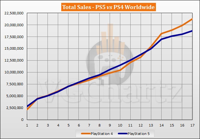 目前(截止到今年3月),PS5的全球总销量已经达到了18,709,382台,作为对比,上代主机PS4发售第17个月的全球总销量为21,221,135台。PS4看起来更强一些,而到目前为止,PS4的总销量已经达到了1.1675亿台。