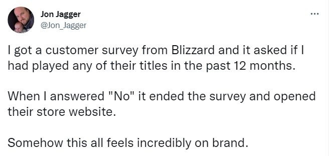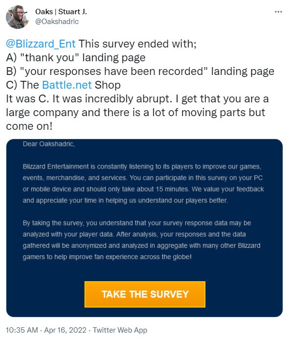 还有人称,在回答玩所有问题后,该问卷并没有像往常一样感谢玩家的反馈,反而也突然转向了暴雪的商店页面,这在以前重来没有过。