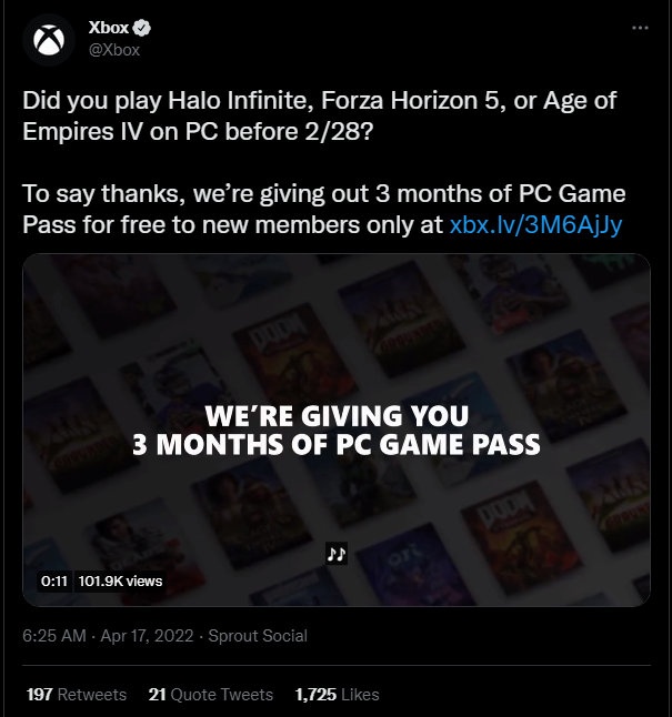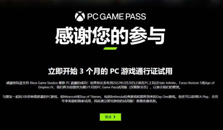 微软发推文表示从游戏正式发售到2022年2月28日期间,任何在PC上玩过《光环:无限》,《极限竞速:地平线5》或《帝国时代4》的人都有资格获得为期3个月的PC Game Pass试用版。