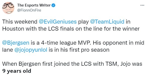 当Bjergsen和TSM第一次打LCS时,Jojopyun才刚刚9岁。”