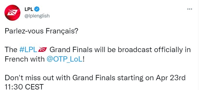 LPL官推原文:你讲法语吗?OTP将为LPL春季赛决赛带来官方法语流解说!不要错过4月23日的比赛!